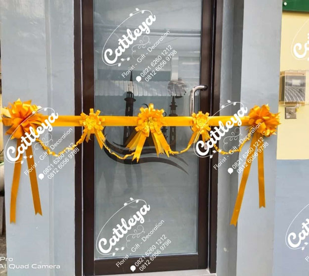 Pita yang di rangkai dan di bentuk cantik memanjang dan di tempelkan di depan pintu. Biasanya di pesan saat acara memasuki kantor baru, atau gedung usaha baru. Pita akan di gunting oleh orang yang di tentukan saat akan masuk ke dalam kantor baru. Kami menerima pesanan dan jual pita peresmian kantor cantik dan harga murah. Untuk info dan pemesanan, hubungi kami melalui tautan yang tersedia di bawah ini.
