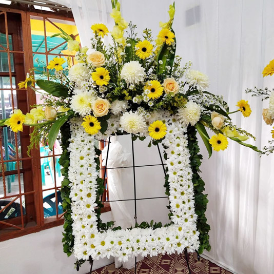 Karangan bunga ini dirangkai berbentuk seperti bingkai (frame) foto berbahan bunga segar dan dipesan saat acara dukacita. Di bagian tengah biasanya dipasang foto orang yang sudah meninggal dunia dan di tempatkan di dalam ruangan duka. Rangkaian bunga ini melambangkan ungkapan turut berdukacita. Kami menerima pesanan pembuatan bingkai bunga duka di Medan maupun luar kota.
