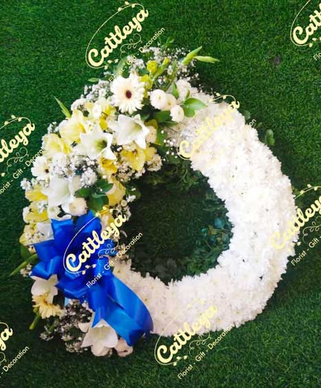 Karangan bunga ini di rangkai dengan menggunakan bunga melati segar serta paduan bunga lainnya. Bunga di rangkai bentuk bulat dengan tambahkan potongan pita. Bunga ini di rangkai sebagai simbol turut berduka cita dan umumnya di pesan oleh umat Kristen. Kami menerima pesanan pembuatan karangan krans bunga duka untuk lokasi rumah duka di Medan, harga murah dan proses rangkai cepat.