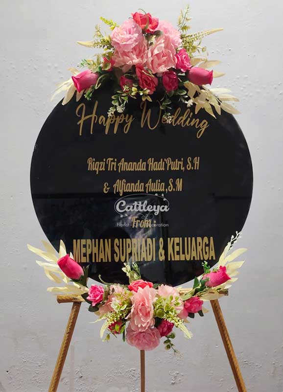 Karangan bunga papan akrilik ini disampaikan sebagai bentuk ucapan selamat berbahagia kepada pengantin yang melangsungkan pernikahan.