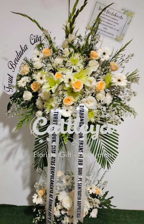 Rangkaian bunga standing bahan bunga segar dan pita putih ungkapan turut berdukacita